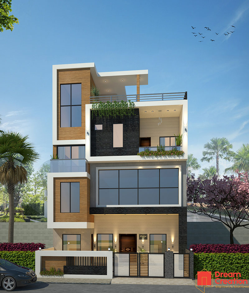 Dream Creation Indore offer a wide range of readymade bungalow architecture & interior planning at affordable price. And also we work according to client needs. This plan is designed for 30*60 plot with exterior design, elevation working drawing, furniture and false celling plan for G+2 residential house which is located in Indore (MP).