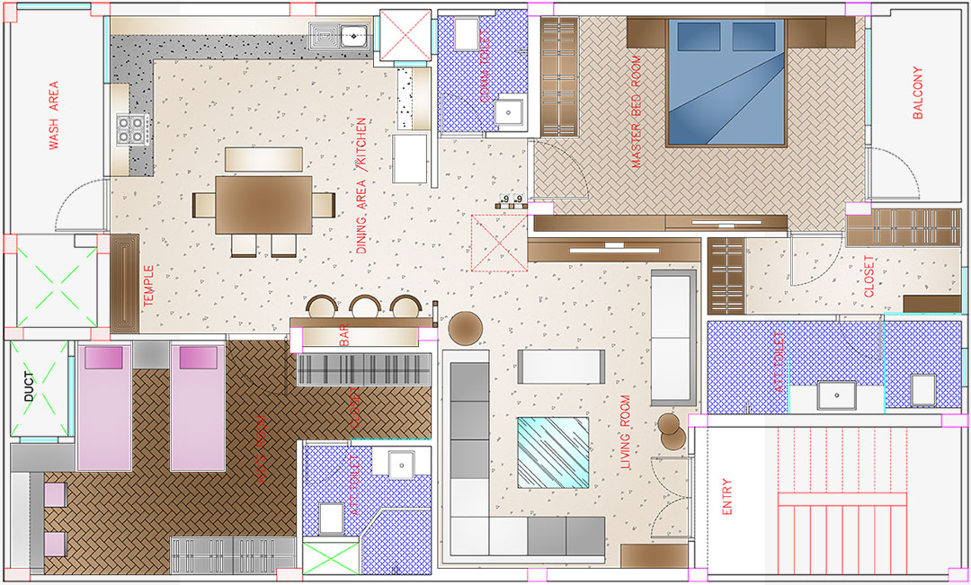 Basically in this house we have designed 1 master bedroom, kid’s room, temple, bar, wash area, luxurious open kitchen with dinning section, balcony, duct. And also viewers can check working plan images in project section. Mr Dutta was quite satisfy with our services and he approach our firm many times due to our work and time punctuality.