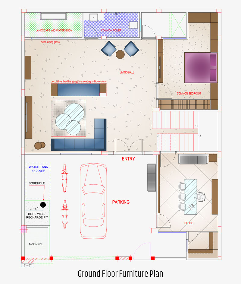 In ground floor part we had plan car parking, water tank, bore well point, office, common room, drawing section, landscape with water body, common washroom, fixed hanging swing to hide column. In first floor 2 bedroom, kitchen, common wash area, dining hall, temple, store room, artificial landscape garden and balcony. In second floor we had plan 3 bedroom, hall, balcony and open area. Also we had planned luxurious interior & furniture in this villa. And also viewers can check working plan images in project section.